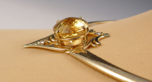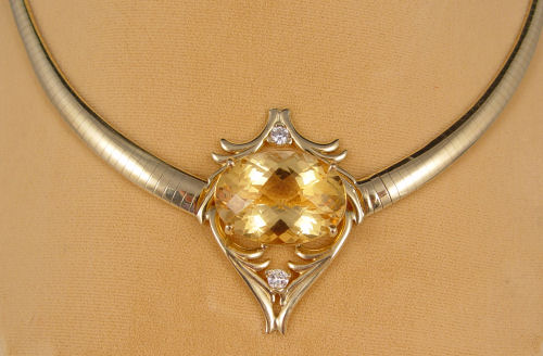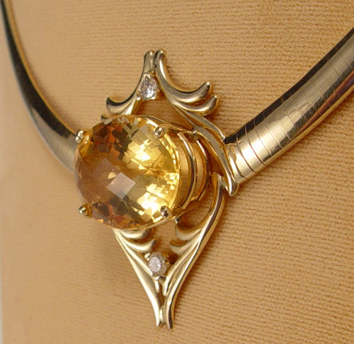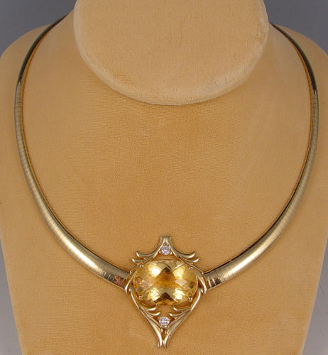 26 CT CITRINE WITH DIAMONDS OMEGA NECKLACE: Custom 14K yellow gold necklace featuring an approx. 26.46 ct oval mixed cut citrine, clarity of VVS2, SLOy Hue, 2 tone, 2 saturation. The setting also has two round brilliant cut diamonds, approx. .40 Ctw., average SI1 clarity and G-H in color. All gems are prong set. The necklace is a tapered dome Omega. Approx. 40.7 grams. Sold with current Florida Diamond Appraisers GIA graduates appraisal for $4250. Est. $2000/3000**