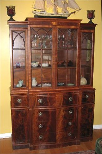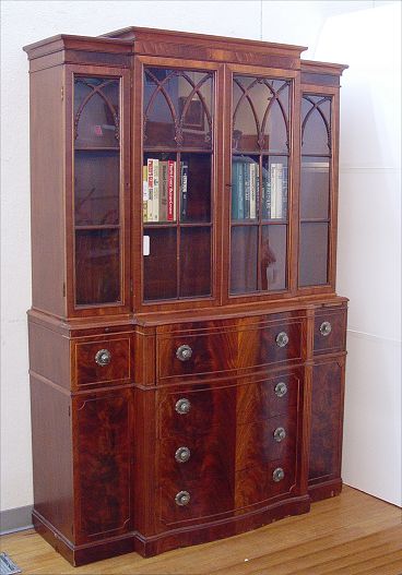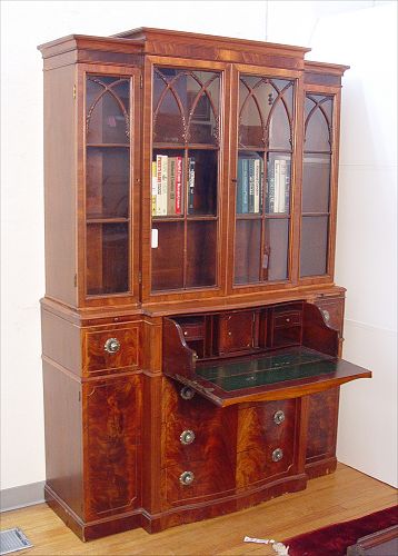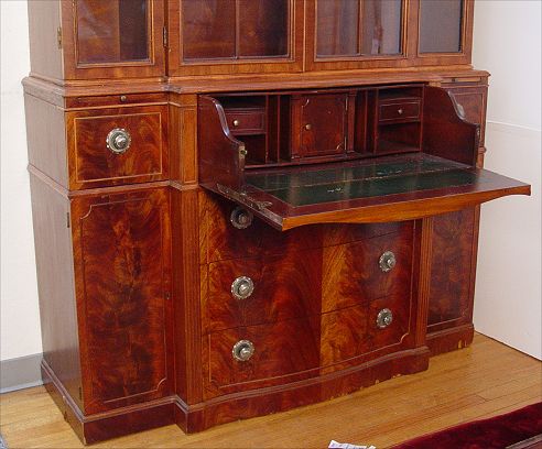 RICHLY GRAINED BANDED MAHOGANY BREAKFRONT SECRETARY DESK: Bookcase or china display, fall front desk over three drawers. The pulls are unusual embossed silver metal. Measures 80 1/4'' high x 54'' x 19 1/2''