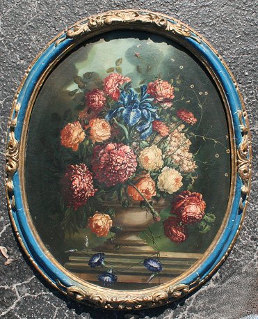 CONTINENTAL SCHOOL FLORAL STILL LIFE IN PAINTED OVAL FRAME: Iris, Mums, Cabbage Roses and Morning Glory in an Urn, Oil/Canvas/Board, 27 3/4'' x 22'', painted and gilded gesso frame, as is condition, 31 5/8'' x 26''. Est. $300/500**