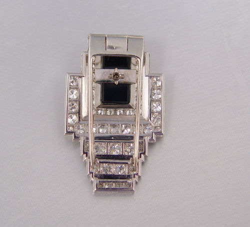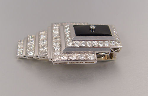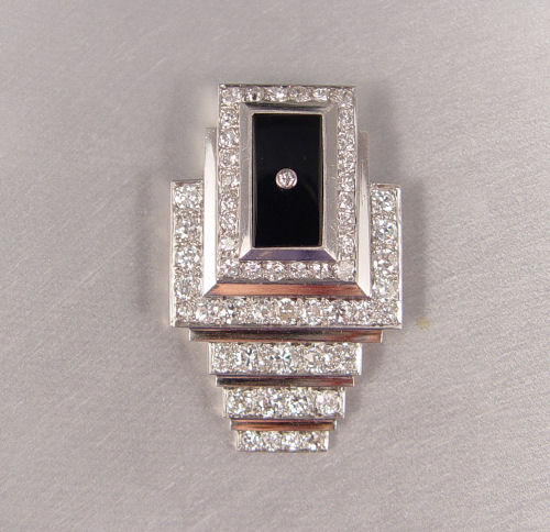 PLATINUM AND 18K DIAMOND AND ONYX ART DECO FUR CLIP: 18K white gold fur clip contains 59 round transitional and European cut diamonds. Weight: 4.00 Ct. Approx. The diamonds average VS-SI in clarity and G-H-I in color. Rectangular shaped black onyx tablet. The diamonds are bead set. Hinged double pin. 2'' long x 1''. Weight: 15.9 grams. Est. $3000/4000**