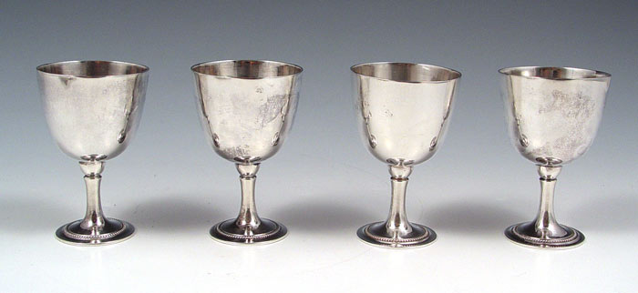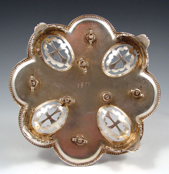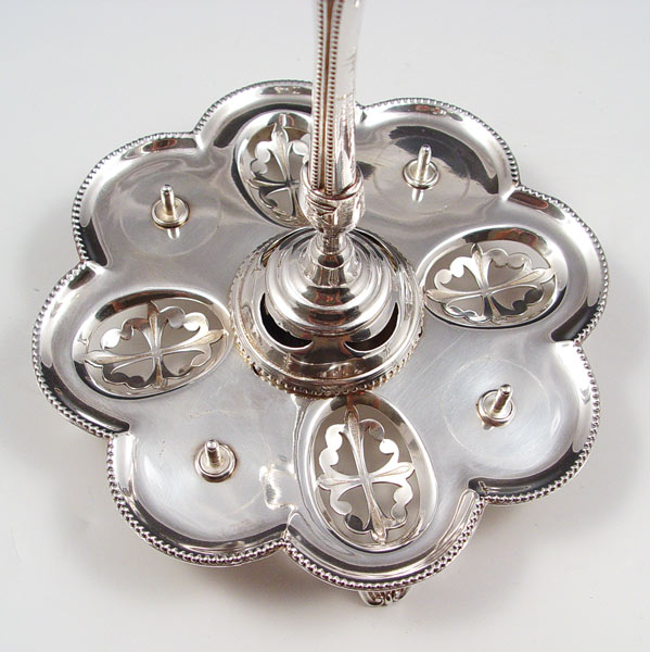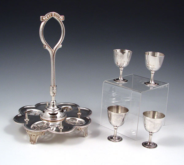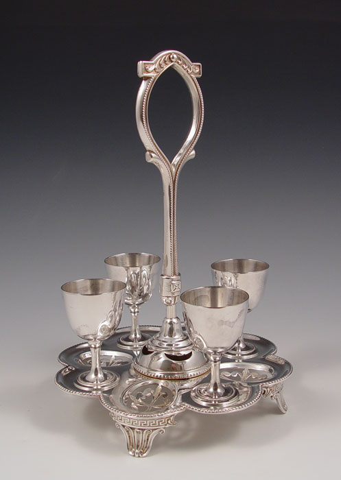 SILVERPLATE EGG CUP STAND 1890: 4 egg cups on posts, and 4 reticulated egg wells. Scratched on date or model number 1890 on base of stand and cups. Measures 9 1/2'' high x 7'' dia.
