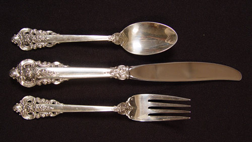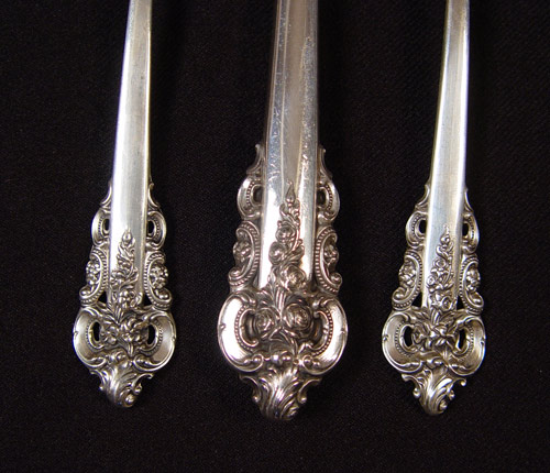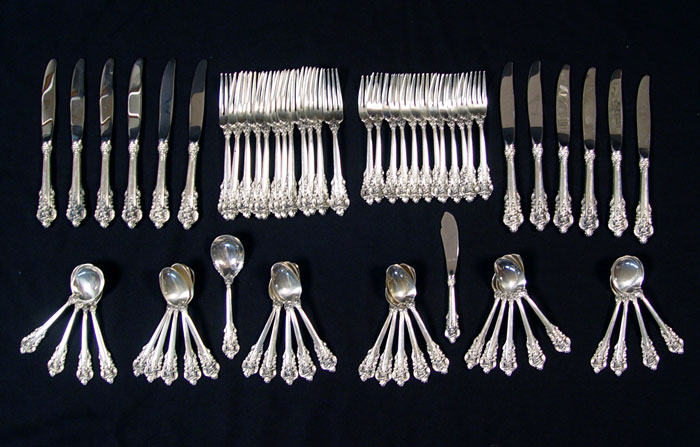 66 PIECE WALLACE GRAND BAROQUE STERLING FLATWARE: Approx. 66 pieces in the Grand Baroque pattern to include 12 dinner forks (7 1/2''), 12 salad forks (6 1/2''), 20 teaspoons (6 1/8''), 8 soup spoons (6 1/4''), 12 hollow knives (9''), hollow master butter knife (6 5/8''), sugar spoon (6 1/4''). No monograms. Approx 85.8 troy oz.