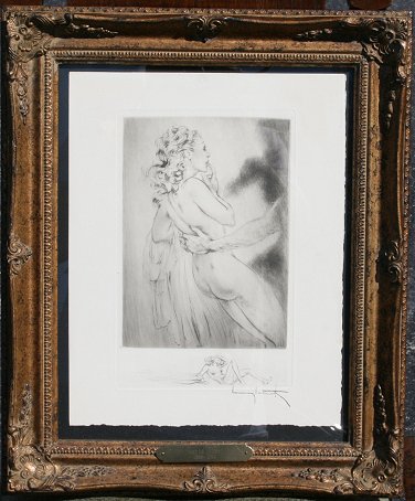 ICART, Louis, (French, 1880-1950): An Etching from the book Les Amours de Psyche et de Cupidon, 1949, depicts a startled woman being embraced from the shadows, signed lower right, paper size 12 1/2'' x 10'', impression size approx. 10'' x 6 1/2'', encased in gilt frame, 17'' x 15''. Est. $200/400**
