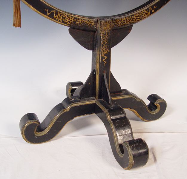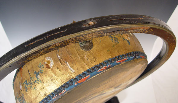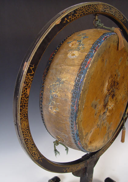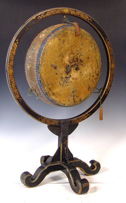 CHINESE CEREMONIAL DRUM AND FLOOR STAND: Lacquer and painted stand, leather drum. Measures 44 1/4'' high x 32'' dia.. Base measures 23 1/2'' square