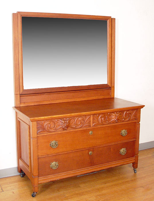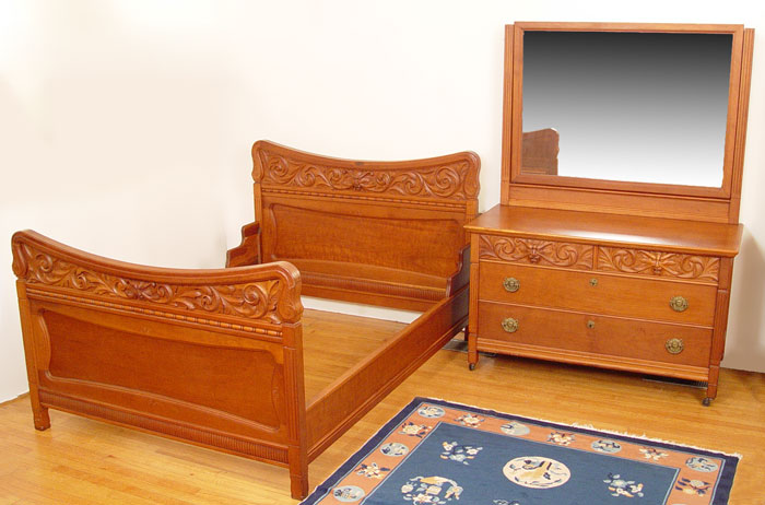 VICTORIAN NORTHWIND CARVED BED AND DRESSER WITH MIRROR: Matching chest of drawers with mirror, measures 32 1/2'' high x 54'' x 24'', mirror measures 40 3/4'' x 51 3/4''. Full size bed, headboard measures 44 1/4'' high x 60'' wide, the footboard follows the graceful curve of the head. 39 1/4'' high