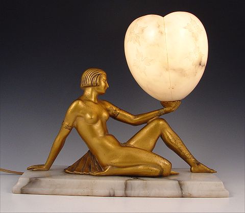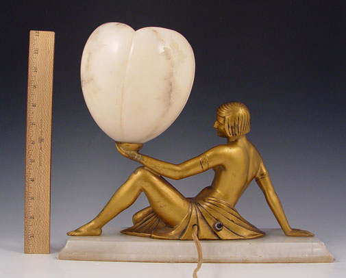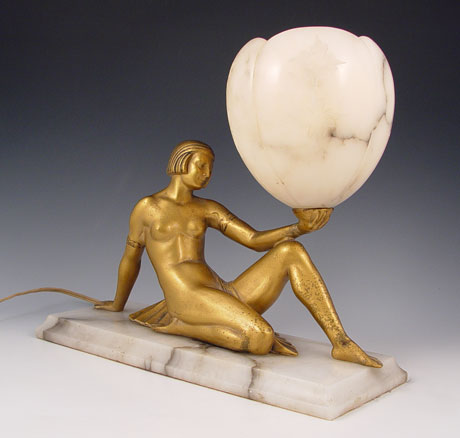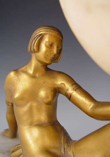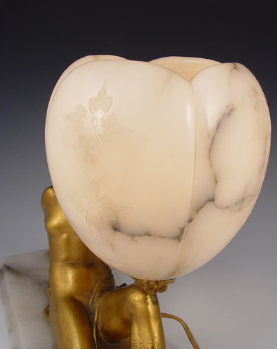 ART DECO NUDE FIGURAL LAMP WITH ALABASTER SHADE: Incised carvings to the alabaster shade, the figure is gilt metal with peppering to the finish. Beveled alabaster plinth. Base measures 8 1/2'' high x 14'' x 5 1/2'', 12 1/4'' high overall.