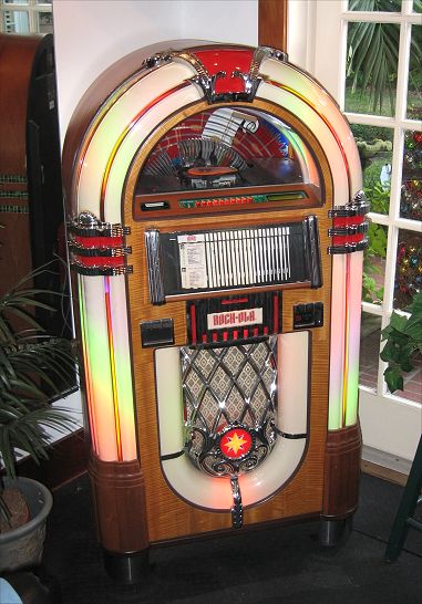 ROCK-OLA SYBER SONIC 8 BUBBLER CD JUKEBOX: Eight tubes bubble along in a case of fine walnut with stainless steel base, die cast triple plated accents. 100 CD capacity. Coin operated or free play. Sold with the paperwork, parts catalog, remote control, and receipt from 1996 for $6495. Serial number 186601. 60''h. x 33'' x 27'', approx. 320 lbs.