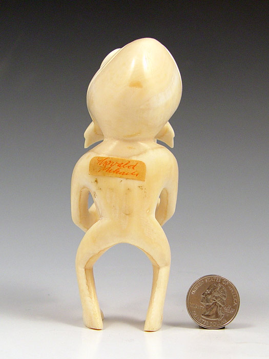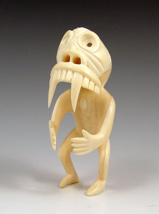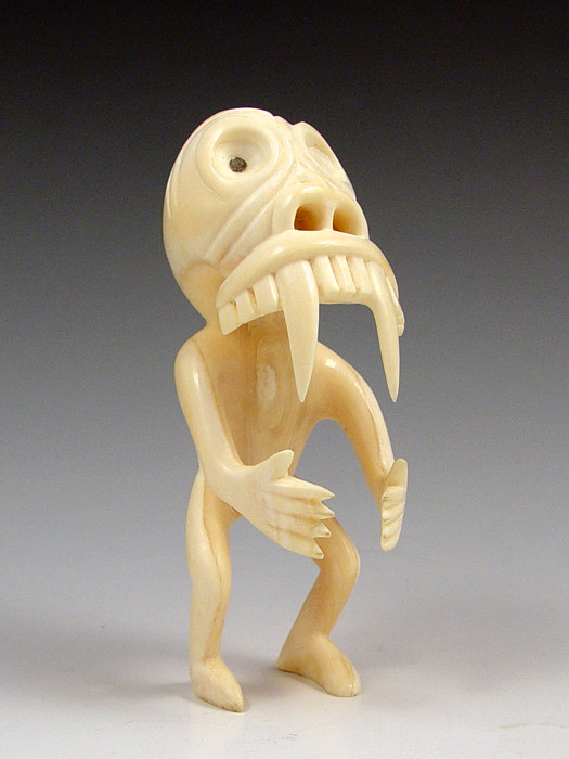 CARVED GREENLAND INUIT TUPILAK WHALE BONE: 20th century figural man with walrus form teeth and metal eyes. Measures 5 1/4'' high. Tupilaks were carved mythical, magical creatures carved by Greenland Inuit peoples for protection and shamanism.