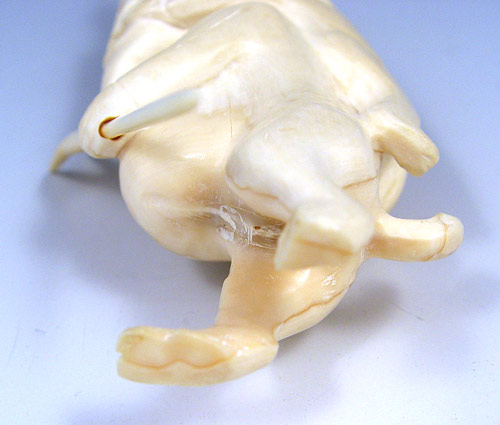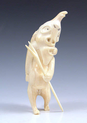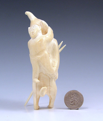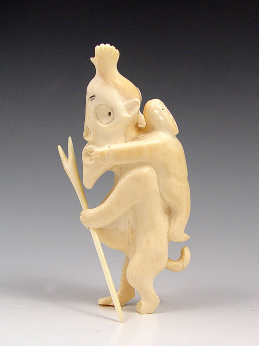 CARVED GREENLAND INUIT TUPILAK WHALE BONE: 20th century figural man with child on his back pulling his mouth and ear, additional hand protruding from head, also has 2 prong spear. Note missing part of one foot. Measures 5 1/8'' high. Tupilaks were carved mythical, magical creatures carved by Greenland Inuit peoples for protection and shamanism.