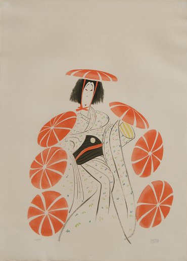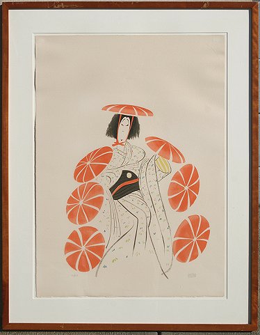 HIRSCHFELD, Al, (American, 1903-2003): Japanese female Kabuki actor, Lithograph, 30'' x 21 1/2'', float mounted, pencil signed, numbered 150/275, encased in custom wooden APF frame with marks to wood, under Plexiglass, 37 1/2'' x 29 1/4''. From the Reeves Lewenthal Collection.