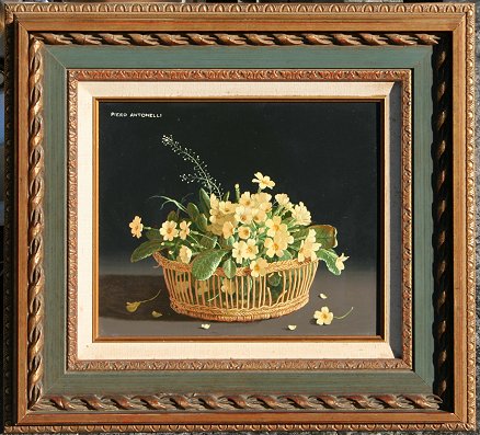 ANTONELLI, Piero, (Italian, 1916-1990): ''Primrose in Basket'', Oil/Masonite, 10'' x 12'', signed, titled verso, carved frame, 17 1/4'' x 19''.