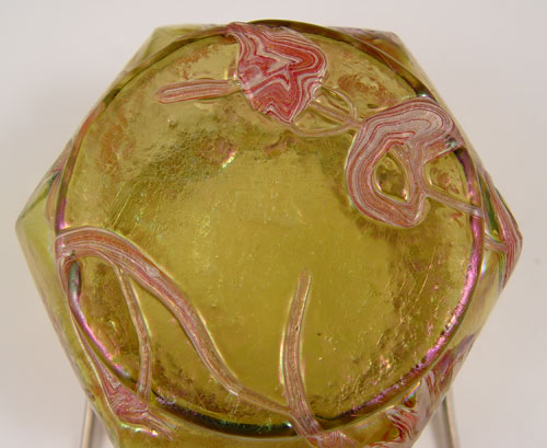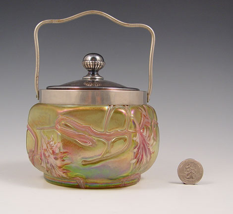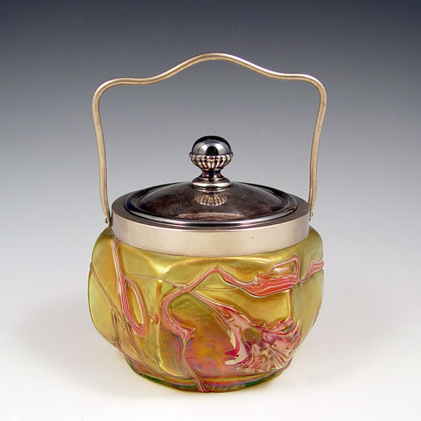 PALLME-KONIG BAVARIAN IRIDESCENT ART GLASS BISCUIT JAR: Ca. 1900. Silverplate mounted jar. The glass is 3 1/4''''h., with the handle raised it is 6 1/2''h. The design and color is seen on page 104 in Truitt's Collectible Bohemian Glass 1880-1940.