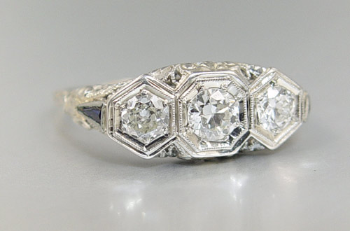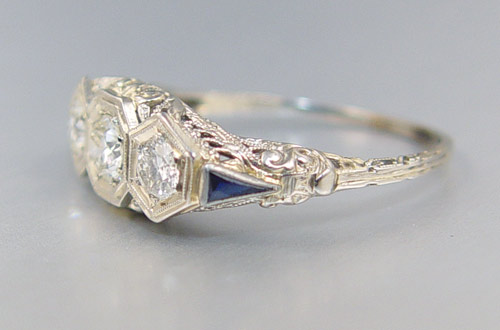 18K DECO FILGREE 3 STONE DIAMOND RING: 18K white gold filigree ring contains 3 transitional brilliant cut diamonds. Weight: .75 Ct. Approx. Rated VS1 in clarity and I in color. The diamonds are prong set. 2 triangle French cut synthetic sapphires. Weight: 3.0 grams. Size 9.