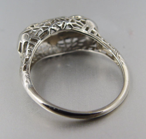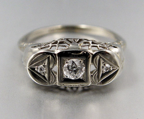 DECO 18K GOLD FILIGREE DIAMOND RING: 18K white gold filigree ring contains 1 old European round cut and 2 round single cut diamonds. Total weight approx. .25 Ct. The diamonds average VS in clarity and H in color. The diamonds are prong set. Weight: 2.4 grams.