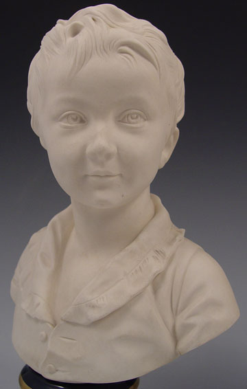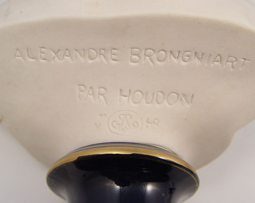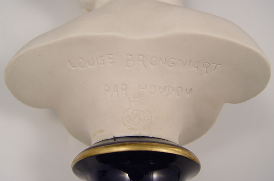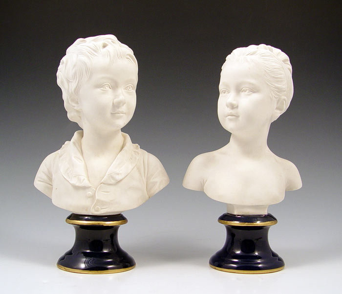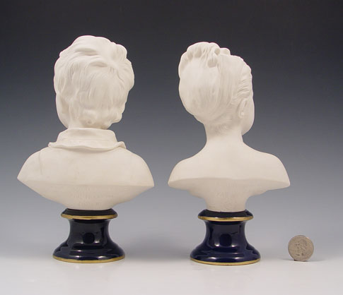 PAIR SEVRES BUSTS AFTER HOUDON: Busts of Louise and Alexandre Brongniart, children of French architect Alexandre-Theodore Brongniart. Coincidentally, the younger Alexandre went on to become a geologist and director of the French Sevres Porcelain Factory from 1800-1847. Cobalt pedestal base, approx. 8''h. Marked Sevres Manufacture Nationale France.