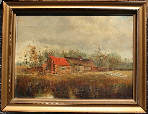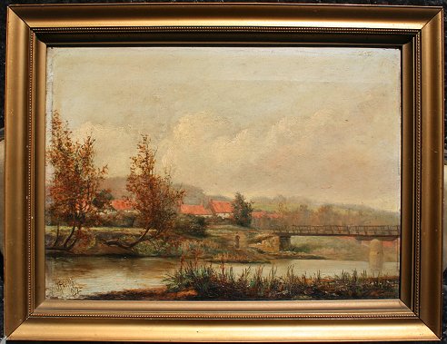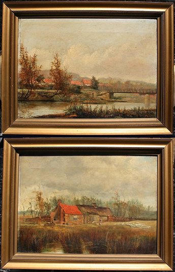 PARKER, James, (British, 19/20th C): 1) ''Winlaton Mill on the Derwent, 1882'', Butterfly Bridge, Oil/Canvas, 10 1/8'' x 14'', titled verso, signed and dated lower left, period gilded frame with minor wear, 14 1/2'' x 16 1/2''. Condition: Stretcher wear, some paint flaking, needs cleaning. 2) ''Bleach Green near Blaydor, 1882'', Oil/Canvas, 10 1/8'' x 14'', signed and dated lower left, period gilded frame with minor wear, 14 1/2'' x 16 1/2''. Condition: Needs cleaning, stretcher bar wear in upper margin. Sold as is.