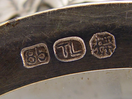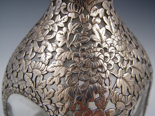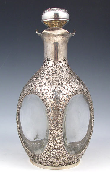 CHINESE SILVER OVERLAY DECANTER: Pierced openwork floral design, hallmarked with unknown Chinese maker 850 silver. Stopper is replacement Gorham, note chip. Measures 9 3/4'' high overall x 4'' square.