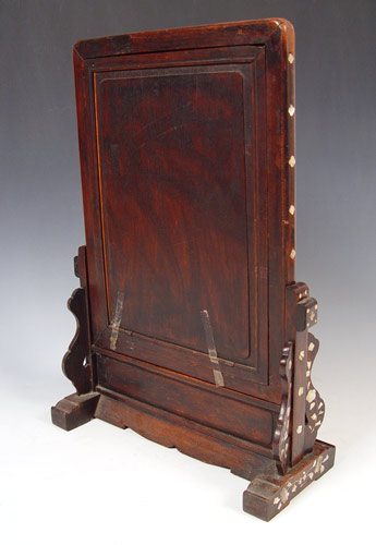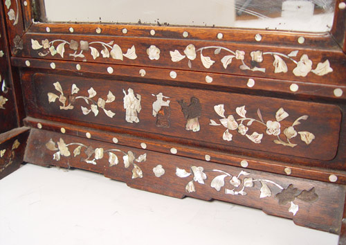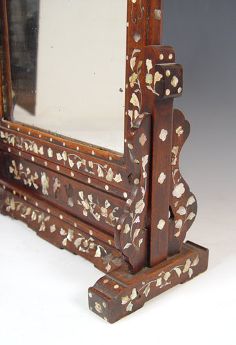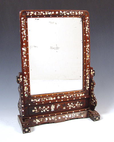 CHINESE MOP INLAY MIRROR ON STAND: Rectangle form, the mirror lifts out of the stand. Silver loss to the glass, some loss of pearl to the frame. 23 1/2'' x 16'' x 7'' overall.