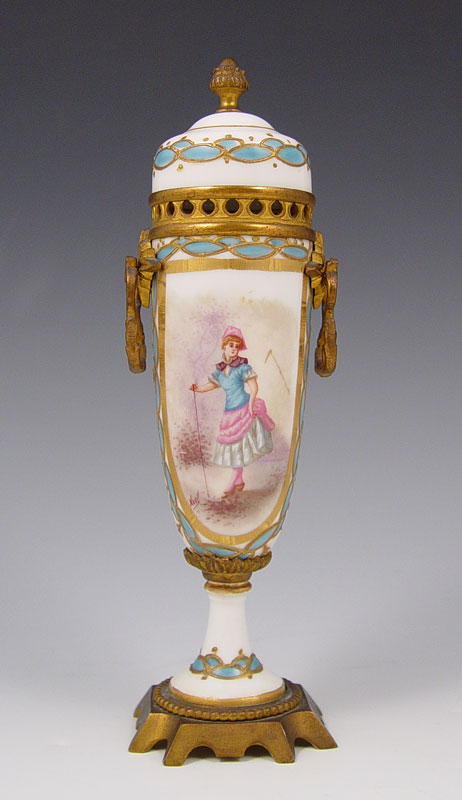 SIGNED SEVRES DIMINUTIVE COVERED VASE: Ormolu mounted signed porcelain covered vase with hand painted figure, signed Noel, floral design verso. Double signed lid and vase. 8''h. x 3 1/2''