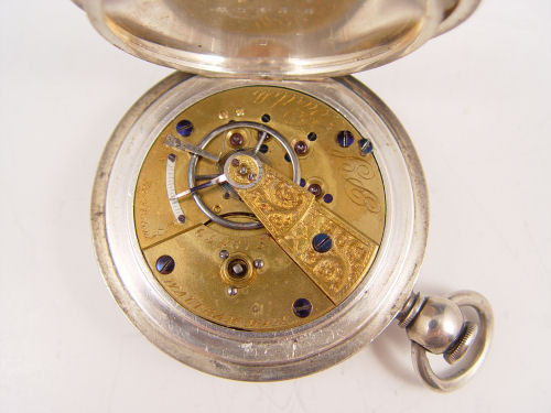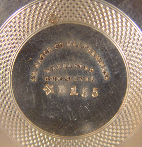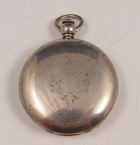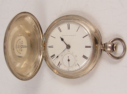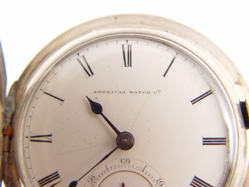 AMERICAN WATCH CO. WALTHAM 18 SIZE ANTIQUE COIN SILVER KEY WIND POCKET WATCH: The case is a 4 oz coin silver with decorative engraving, the interior marked American Watch Co. Waltham Mass. The dial is also marked American Watch. Size 18, ''P.S. Bartlett movement 654675 serial number dates the watch to 1872. Key wind and key set, runs well. The dial does show a couple of hairlines, with no chips or missing material. Sold with the key.