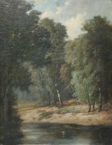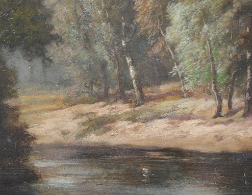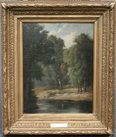 19TH C BARBIZON LANDSCAPE PAINTING: Forest river landscape, OIL/Canvas mounted on board, 17 1/2'' x 13 1/2'', carved and gilded 19th C acanthus leaf frame, 25 1/2'' x 21 1/4''.