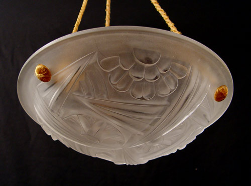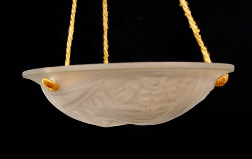 DEGUE FRENCH ART GLASS CEILING LAMP SHADE: Signed Degue. Bowl shape shade in a floral and geometric design, approx 13 1/2'' dia. Original cords.
