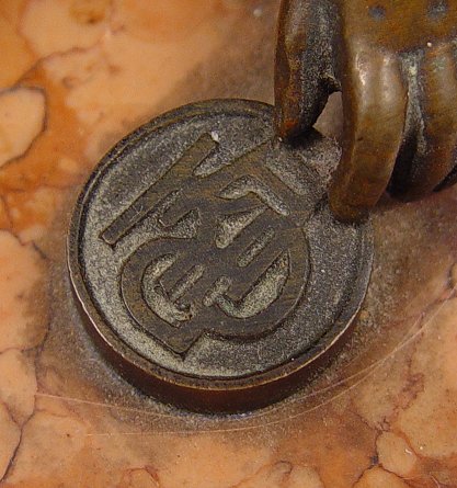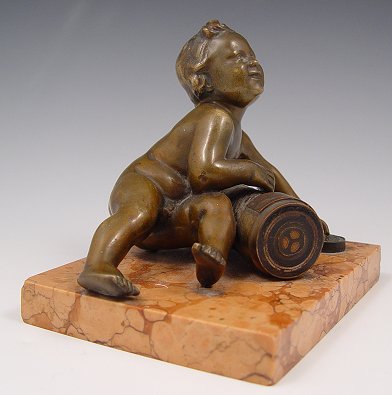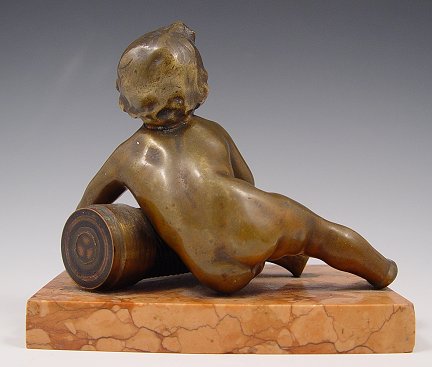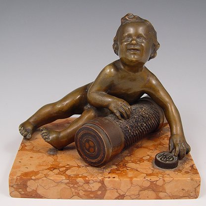 BRONZE CHILD COMMEMORATIVE CELEBRATING TRANSATLANTIC CABLE CROSSING: Bare baby with an actual piece of the Transatlantic cable, sculpture 4 1/4''h., bears an indecipherable monogram KABG?, on pink marble base, 5 3/4'' x 4 1/2'', overall 5''h.
