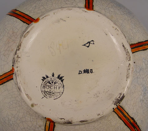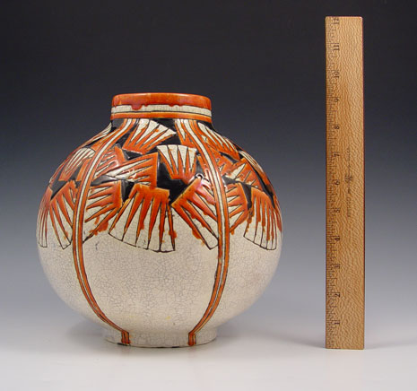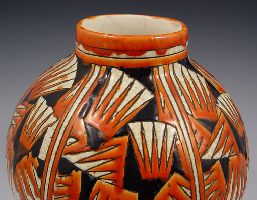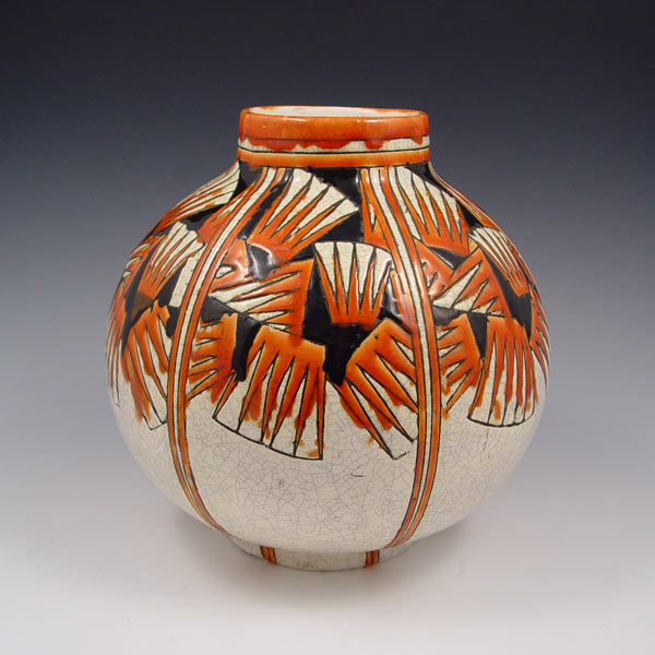 BOCHE FRERES CHARLES CATTEAU BELGIUM ART DECO EARTHENWARE VASE: Bold coloration and design using the cuerda seca black dry line technique, crackle glaze, bulbous body. 9 1/2'' tall, 9'' dia. overall, rim is 3 1/2'' dia. Stamp under base.