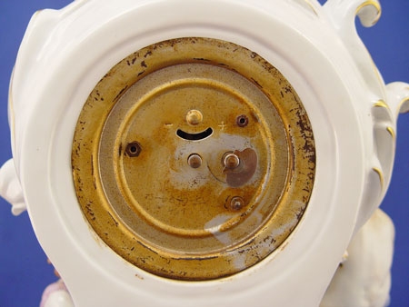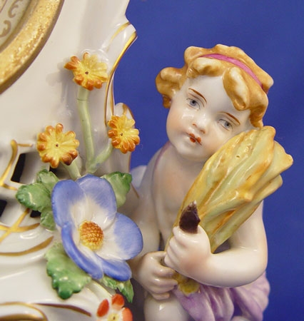 VON SCHIERHOLZ CHERUB AND FLOWER DECORATED PORCELAIN MANTLE CLOCK: Von Schierholz blue mark under glaze. White porcelain with applied flower decoration and 2 putti. Dial with some discoloration. The hand wound clock is ticking. No marks on works. 12 1/2'' tall x 8 1/2'' wide x 5'' deep. Please note minimal chip on implement in child's hand and 2 petals.