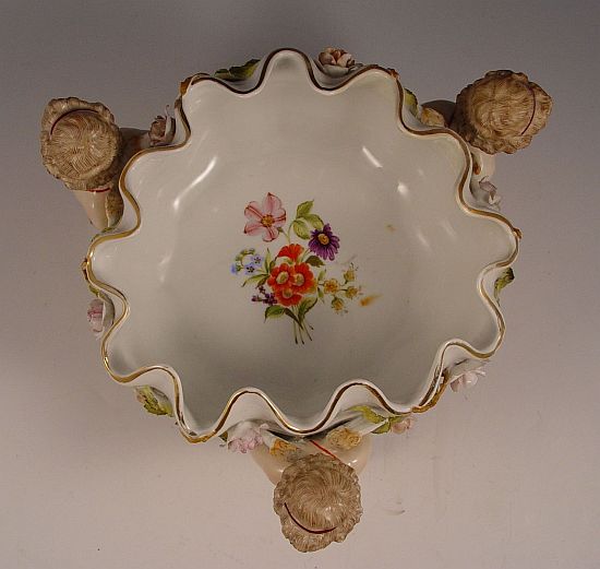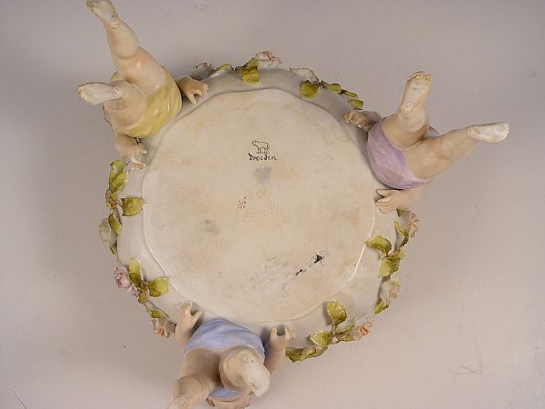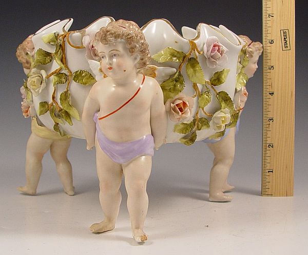 A. LAMM DRESDEN GERMAN PORCELAIN CENTER PIECE: Ca. 1887-1949. Applied rose laden vines on a ruffle rim bowl supported by three figures of Cupid. Bowl is 7'' dia. excluding Cupid. 7''h. Bears the Dresden mark of Ambrosius Lamm. Please note restoration to feet.