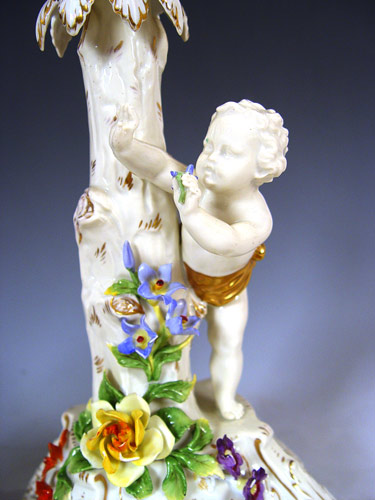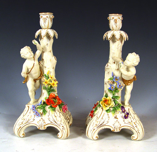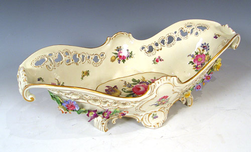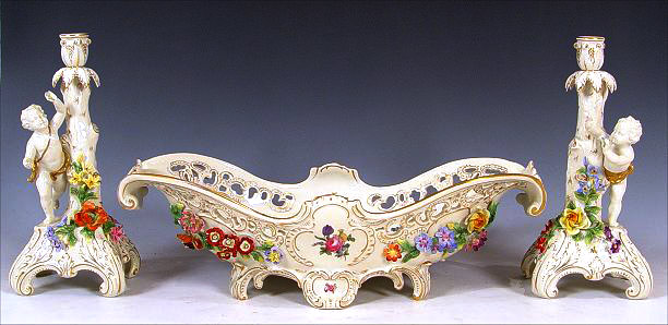 DRESDEN PORCELAIN CENTER BOWL AND CANDLE HOLDERS: Carl Thieme fine porcelain reticulated center bowl embellished with painted and applied flowers, 20 1/2'' long x 5 1/2''h. Sold together with the pair of Thieme Dresden cherub figural candle holders, 12''h.