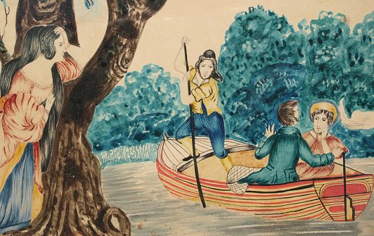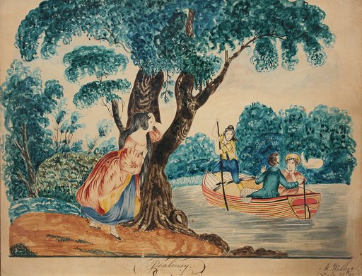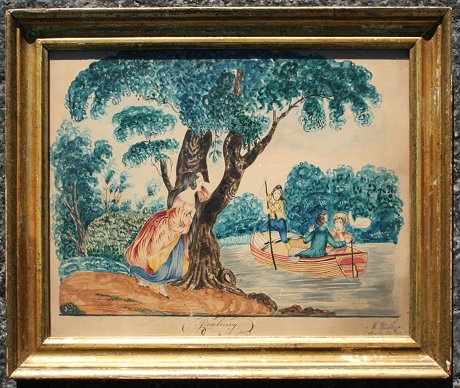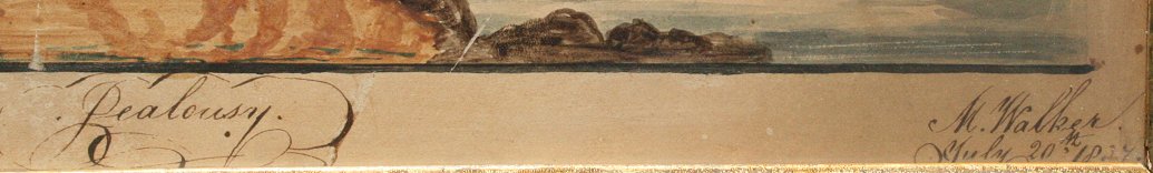 19th C AMERICAN FOLK ART WATERCOLOR ''JEALOUSY'' SIGNED M. WALKER: 11'' x 14'', signed and dated July 20, 1827, encased in period gilded frame with wear, 13 1/2'' x 16 1/2''.
