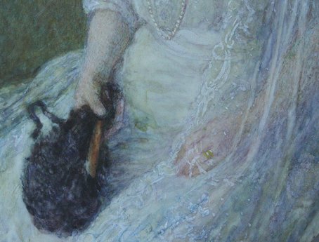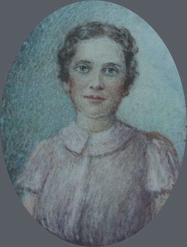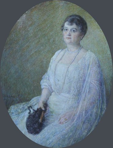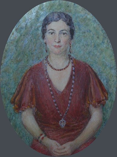 ARCHAMBAULT, Anna Margaretta, (American, 1856-1956): 4 miniature portraits on ivory. Each oval portrait is framed in golden framed case to hang. Anana Archambault was the Director at the Philadelphia School of Miniature Painting. Lot includes 1) 5'' seated woman wearing lace shawl , pearls & black purse. 2) 3 3/4'' woman in red dress. 3) 2 3/4'' young woman in pink dress. 4) 2 1/2'' portrait of gentleman in yellow/tan blazer and bow tie.