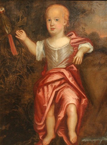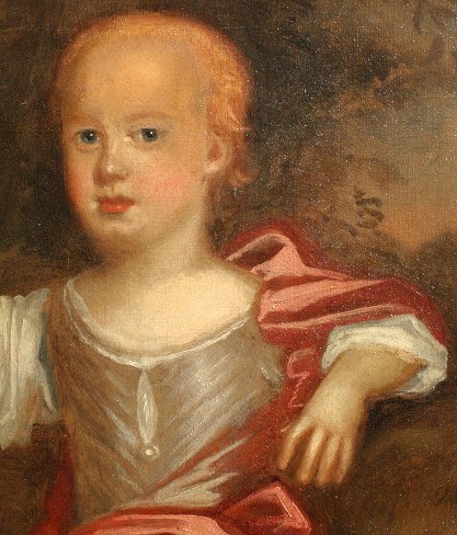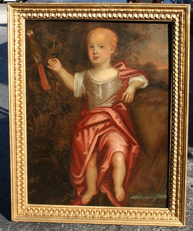 18th C AMERICAN PORTRAIT OF A YOUNG BOY: Exceptional early portrait of a child in a landscape with bird, OIL/Canvas, 31 1/2'' x 25'', encased in painted carved frame, 36'' x 28'', direct from an Atlanta estate.