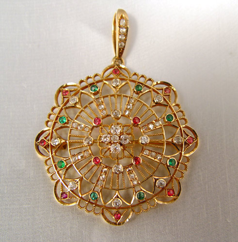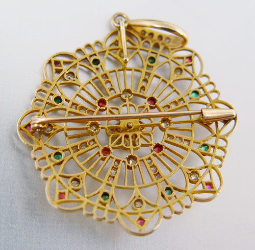15K VICTORIAN DIAMOND AND COLORED STONE BROOCH: Pendant brooch contains 21 old mine cut diamonds and 24 rose cut diamonds, approx. 1.50 ctw. The diamonds average VS-I1 in clarity and H-I-J in color. The diamonds are prong and bezel set. Enhanced with 20 red and green synthetic stones of unknown origin. Weight: 11.8 grams.