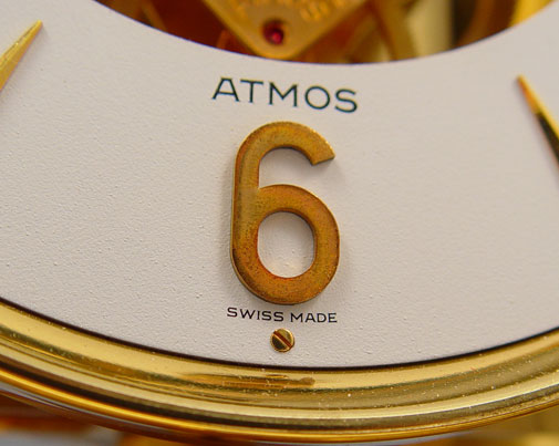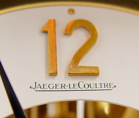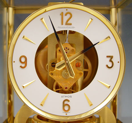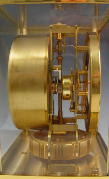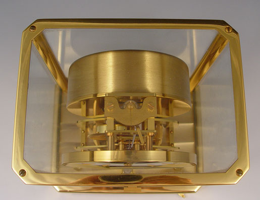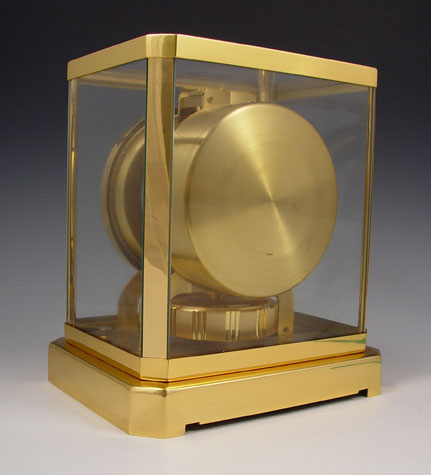 JAEGER-LECOULTRE ATMOS PERPETUAL MOTION CLOCK: Circa 1973, serial number 376,423. Brass case with glass on all 4 sides and top, note chip one corner front glass, remnants of old sticker remains on front brass. Appears to be running correctly, however all clocks are sold as non-functioning. Measures 9 1/8'' high x 8 1/4'' x 6 1/4''.