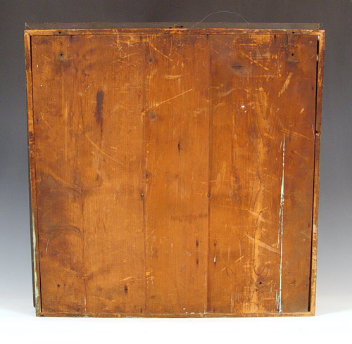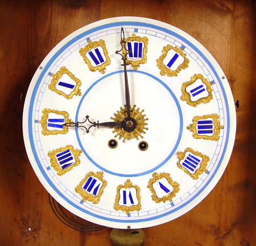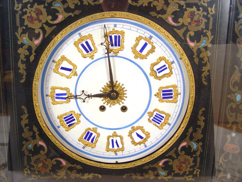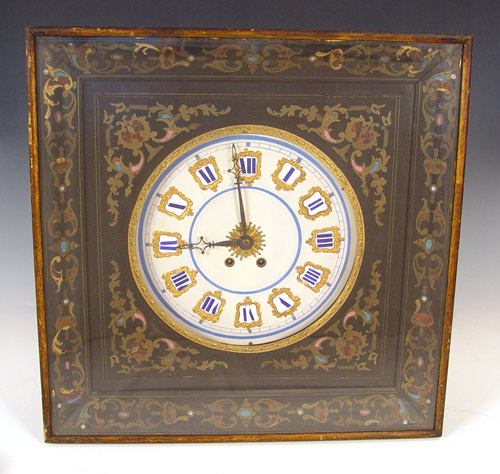EUROPEAN ENAMEL & INLAY PICTURE FRAME CLOCK: Porcelain face with enameled Roman numerals. Hinged case with inlayed enamel & metal decoration under glass. Key and pendulum mechanism. Frame measures 23 1/4'' square.