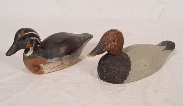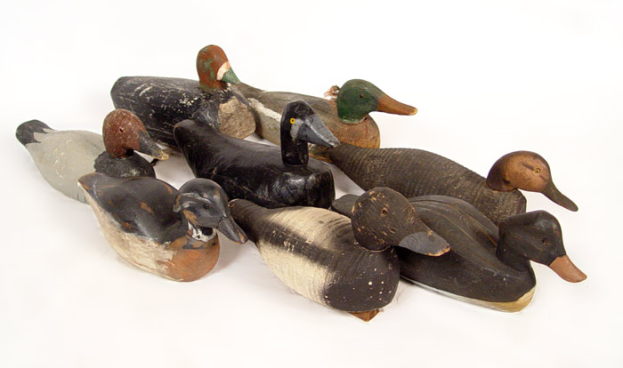 COLLECTION OF 8 VINTAGE HANDMADE DUCK DECOYS: Working decoys To include 1) Pratt Decoy Co. canvasback, missing weight, 6 1/2'' high x 16'' long. 2) Monroe, MI area Merganser, original weights 6 1/4'' x 17 1/2''. 3) Brewer, Maine area mallard with original weights & hardware, 7 1/2'' x 12 1/2''. 4) Unknown wood duck, repaint, no hardware, 6 1/4'' x 14 1/4''. 5) Unknown canvasback, missing one eye, original weight, 7 1/4'' x 14 1/4''. 6) Unknown black duck, missing hardware, 8 1/4'' x 12 1/2''. 7) Unknown Merganser hen, original weights, 5 1/2'' x 17''. 8) Unknown duck, note split in back, no weight, measures 6 1/4'' x 16 3/8''.