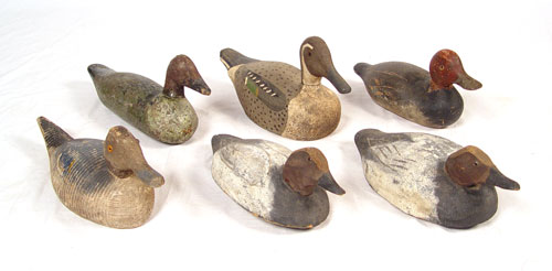 COLLECTION OF 6 VINTAGE HANDMADE DUCK DECOYS: 6 piece working decoys, unknown makers to include 1) Merganser, original weight, 6'' high x 15'' long. 2) Mallard, missing weight, 7 1/2'' high x 15 1/2''. 3) Mallard, hollow carved, no weight, measures 6 1/2'' x 17''. 4) Black duck, measures 6 1/4'' x 13 3/4''. 5) pair unknown ducks, impress CCS mark on bottom, original weights, measures 4 1/2'' x 13 1/2''.