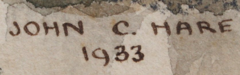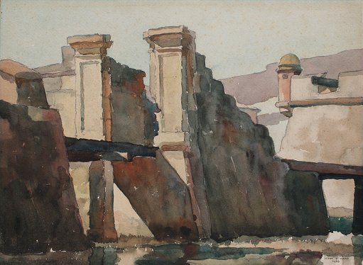 HARE, John C. (American, 1908-1978): Fort San Marcos, Saint Augustine, Florida, W/C, 11'' x 15'', signed and dated 1933, gold frame with wear, 16'' x 21''. Some scattered brown spots.