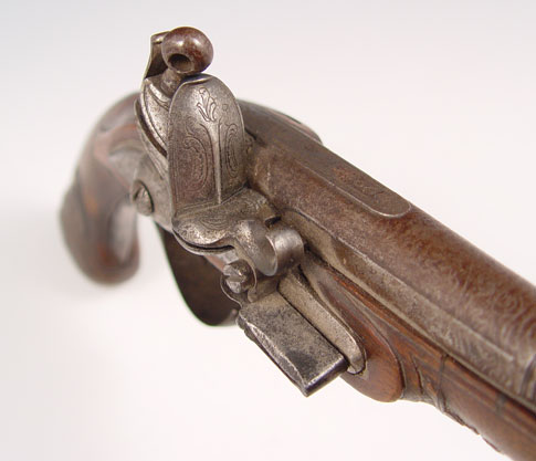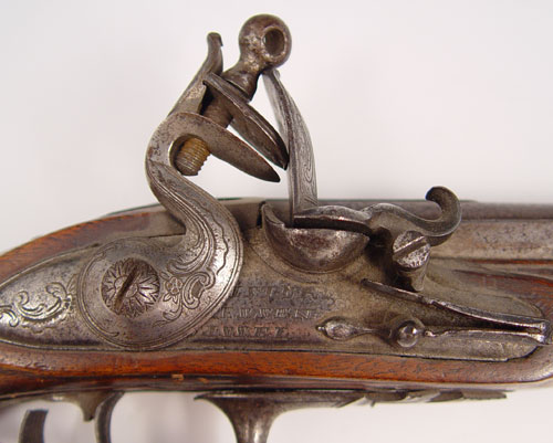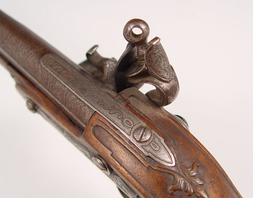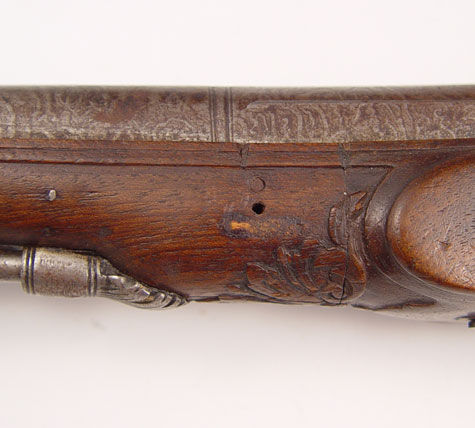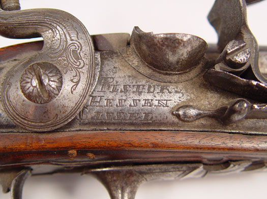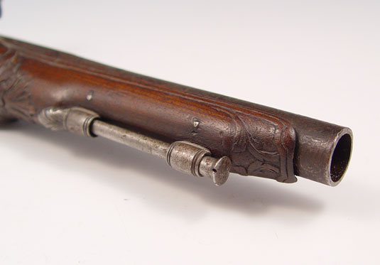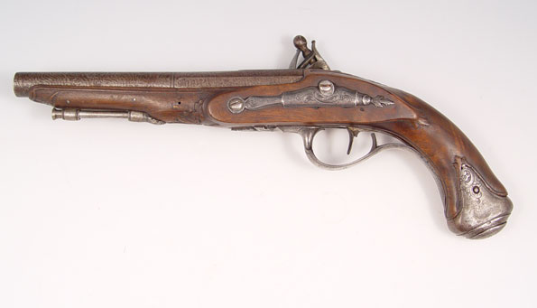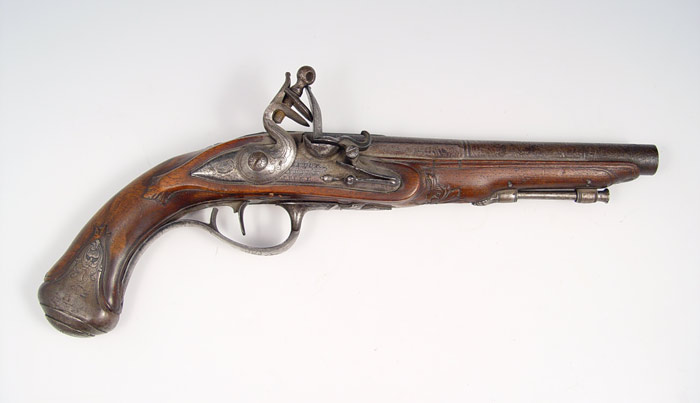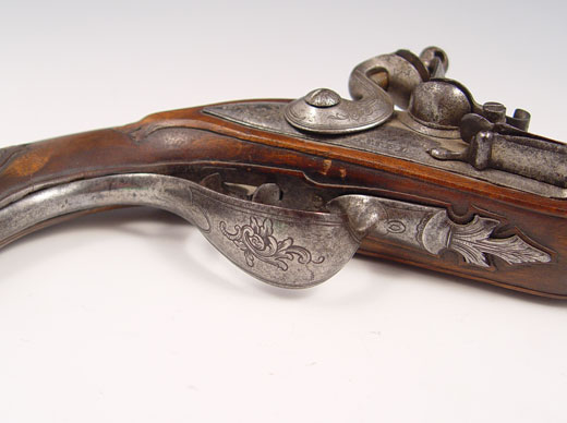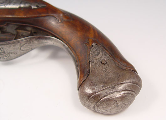 18TH C GERMAN BERNARD PISTOR FLINTLOCK PISTOL: Circa 1760-1780, marked Pistor Hesse Cassel, fine engraving on mounts and lock, intricate carving on stock, forearm wood appears replacement of the period, very well done. Dammascus barrel, action nice and tight. Note small dent almost unnoticed on buttstock hardware. Barrel measures 8'', 13 3/4'' overall.