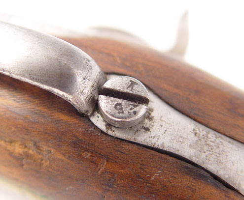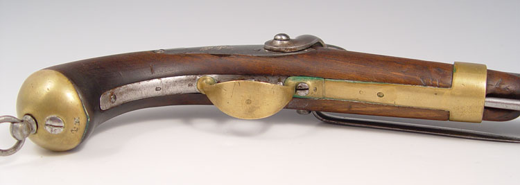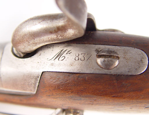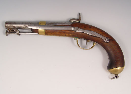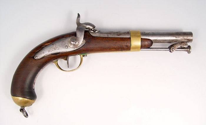 1837 FRENCH MARINE PERCUSSION PISTOL: Percussion action tight, well marked with Chatellerault and partial 1837 date stamp, French touch marks on barrel, plate and understrap. Stock has several nicks and gouges. Barrel measures 6 5/8'', overall 11 1/2''.