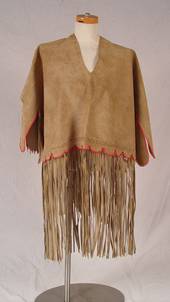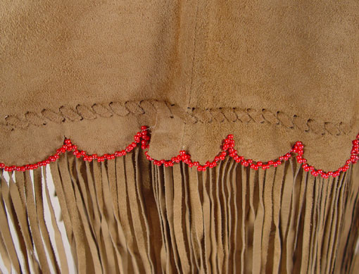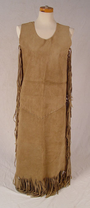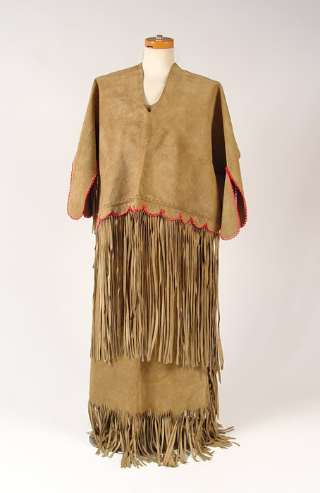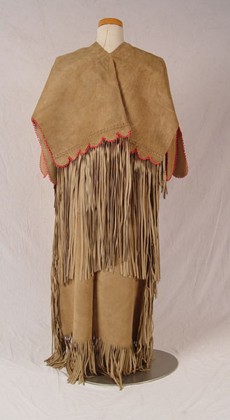 AMERICAN INDIAN WEDDING DRESS: 2nd half 20th century, fringed and beaded trim. Measures 47 1/2'' long x 18'' across excluding fringe. Shawl measures 24'' long.