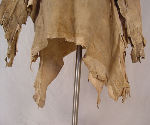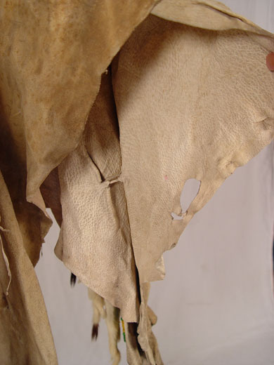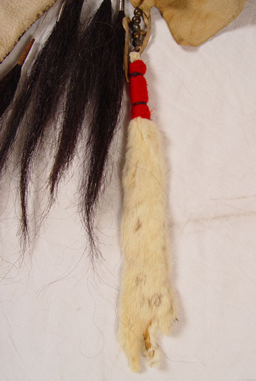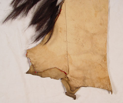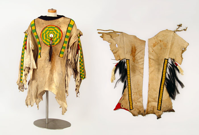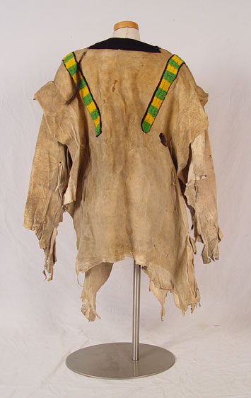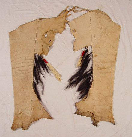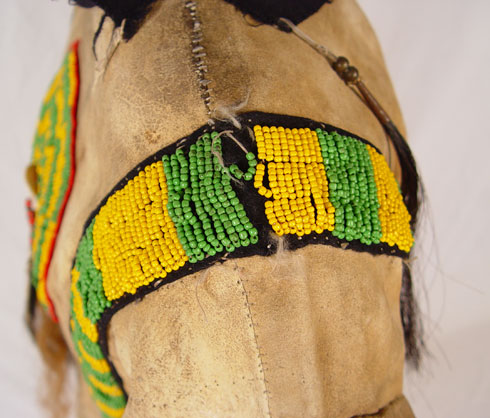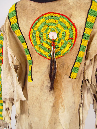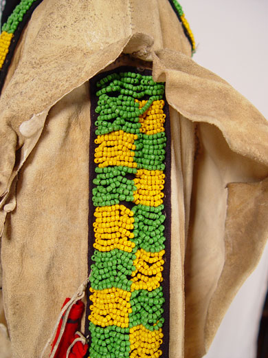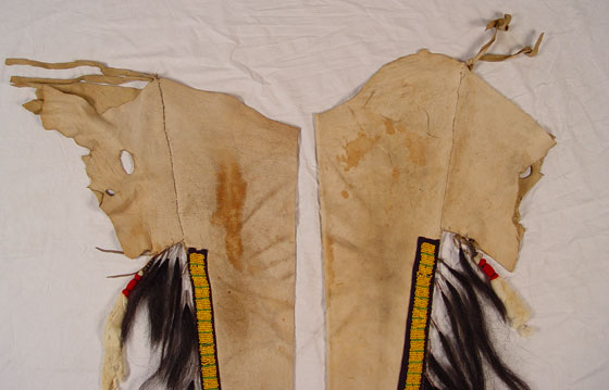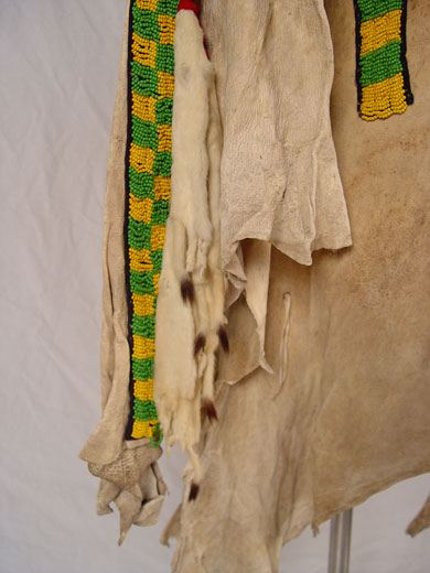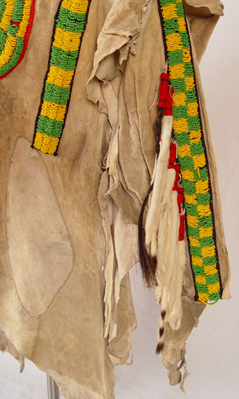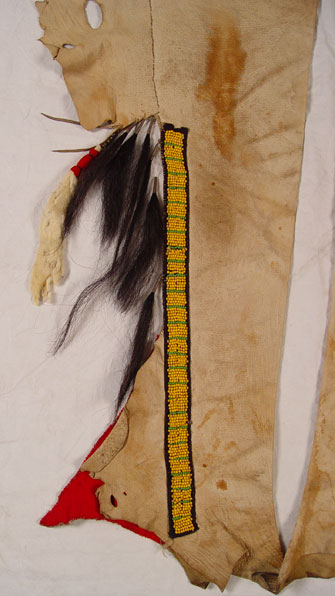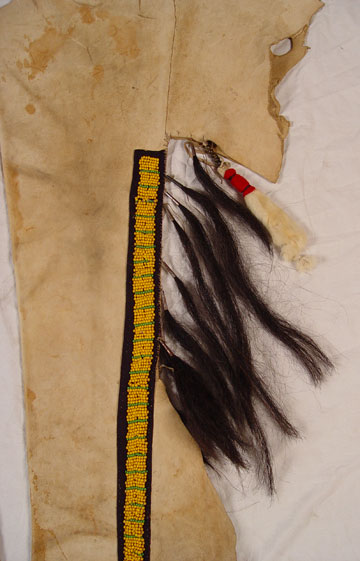 BEADED HIDE NATIVE AMERICAN SHIRT & LEGGINGS: Turn of the century or later Plains Indian hide with geometric green and yellow bead strands affixed to black cloth on both shirt and leggings. Shirt also had circular beaded design with shell and horsehair accents. Sleeves are adorned with 13 long tailed weasel pelts. Missing one pelt, some beads loose, missing. Cloth collar with one horsehair accent piece (other piece missing) and does not appear to be original to piece. Note hide has dried, stiff, stains and has hole. Leggings have yellow and green bands on cloth with horsehair and weasel pelt accents as well. Leggings are 2 separate pieces. Hide is softer on leggings, note stains. Shirt measures 44'' long x 23'' across at shoulders. Leggings measure 38'' long. May have been costume or ceremonial.