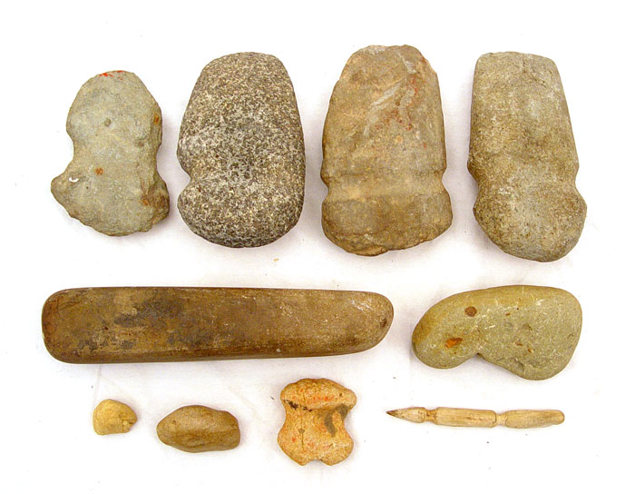 COLLECTION OF 10 NATIVE AMERICAN ARTIFACTS: Assorted artifacts to include 1) 3/4 groove granite axe 6 1/2 x 3 3/4''. 2) Full grooved greenstone axe 6 3/4'' x 3 1/2''. 3) Full grooved greenstone axe, note damage to pole end 6 3/4'' x 4''. 4) Agricultural tool, chisel / hoe 10'' x 2''. 5) Full grooved ryolite 5 1/4'' x 3 1/2''. 6) 4 piece group of Indian net weights. 7) Bone awl or punch 5 1/2'' long. Note overall condition.
