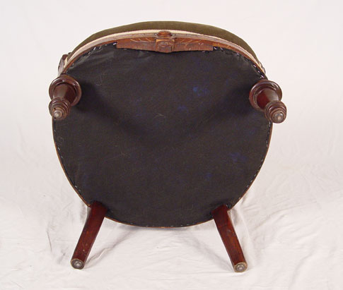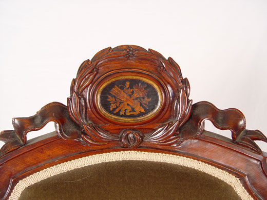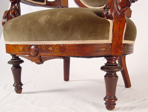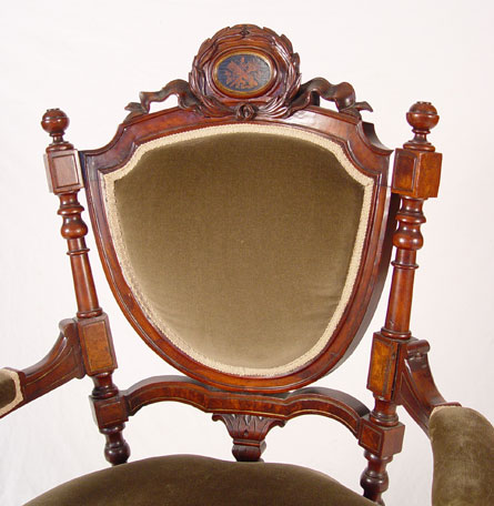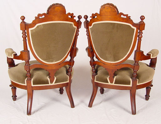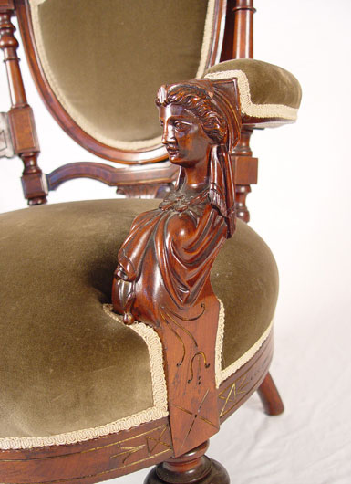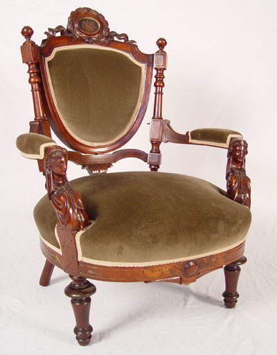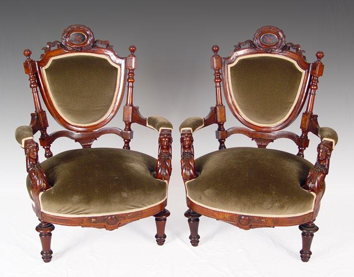 PAIR RICHLY CARVED VICTORIAN PARLOR CHAIRS attrib. John Jelliff: Victorian at its best. Inlay crest medallion over the shield back. Figural lady head arm supports, generous seat, turned front legs. New upholstery. Measures 39 1/2'' high x 28 1/2'' x 30''