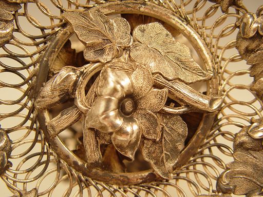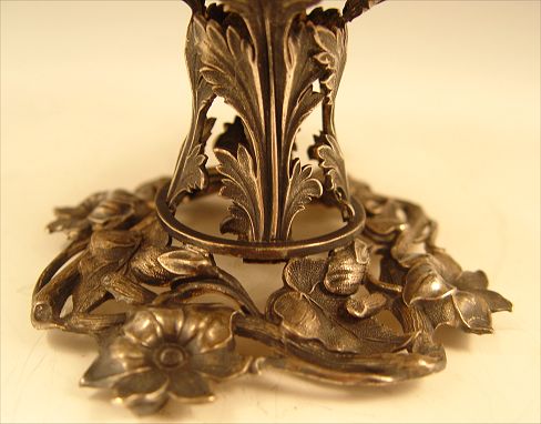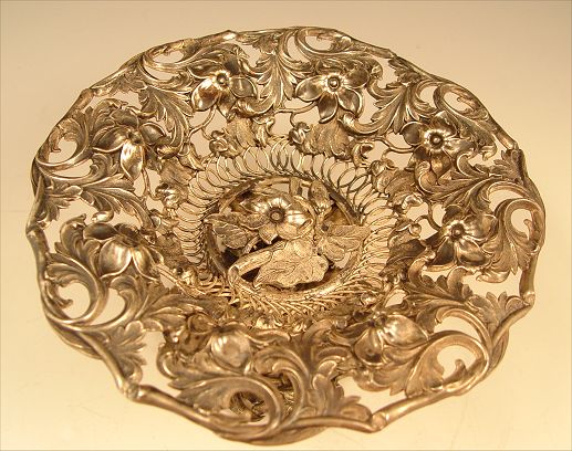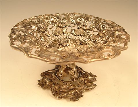 REPOUSSE SILVER COMPOTE: Repousse and open work floral and branch motif. No visible hallmarks or makers marks, unsure of actual metal content. Measures 3 3/4'' high x 7'' dia.