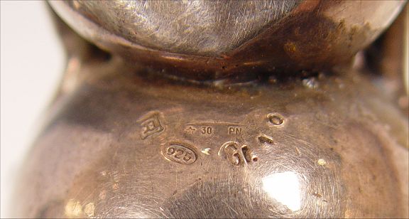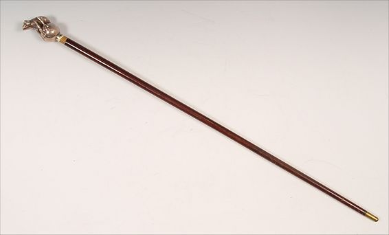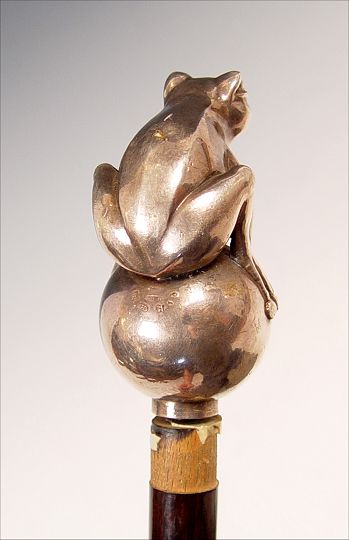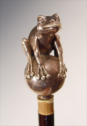 ITALIAN STERLING FROG ON BALL HANDLE CANE: 2nd half of 20th century with Pordone province Italy hallmarks on ball. Wood shaft, brass tip, remnants of bone overlay collar remain. Sterling handle measures 3 1/4'' high, overall 37 1/4'' long.