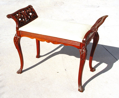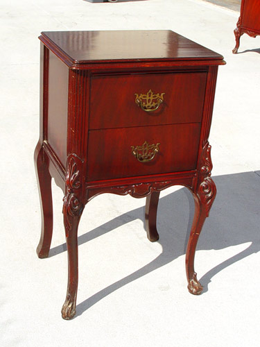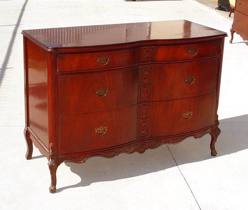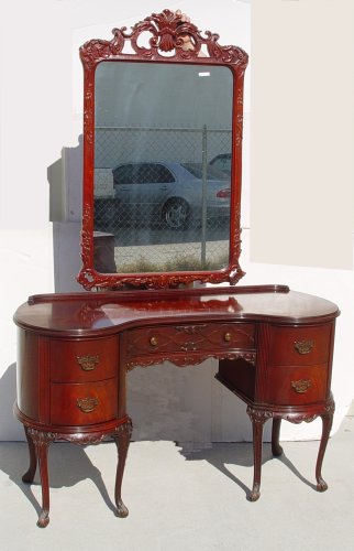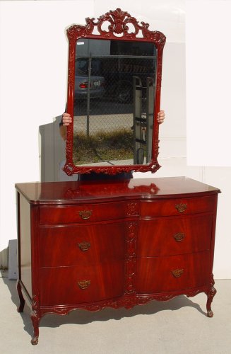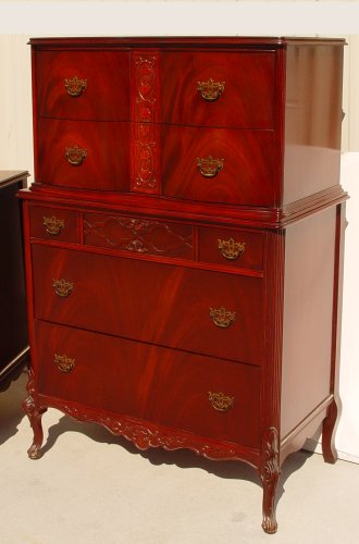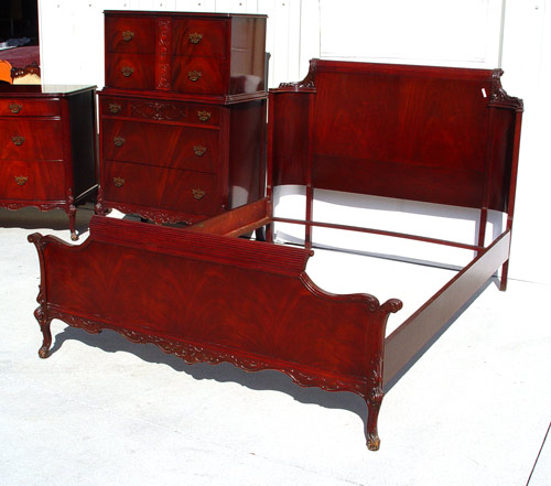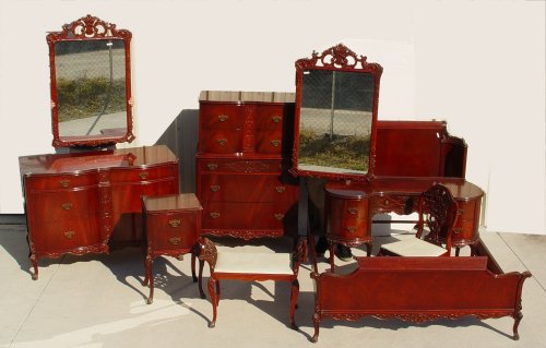 HIGH STYLE 1930'S MAHOGANY BEDROOM SET: 9 pieces to include full size BED with wrap around headboard (45''h. x 57''w), TALL CHEST (54''h. x 35 1/2'' x 20''), double bow front 3 drawer DRESSER (36''h. x 50'' x 22''), kidney shape VANITY (30''h. x 51'' x 22''), CHAIR, BENCH, and 2 wall mount MIRRORS (45'' x 29'')