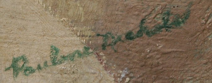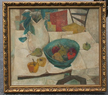NICHOLS, Pauline, (American, 1889-1983): Modernist Still Life with Fruit, Oil/Masonite, 24'' x 28'', signed, carved and gilded frame, 28'' x 32''.